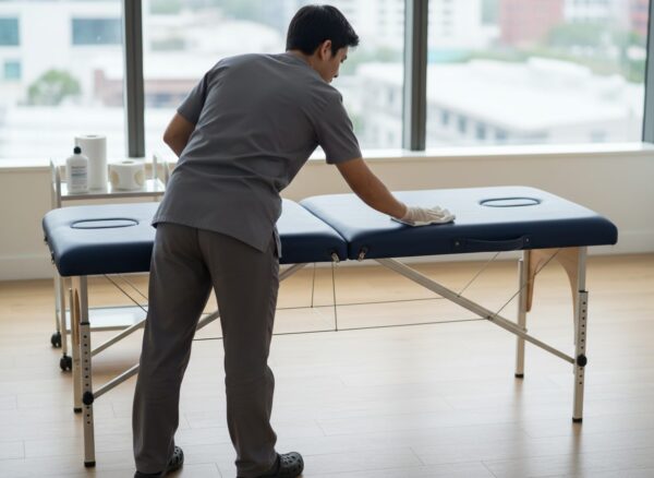 Carry your table with the strap across your body, or use a table trolley if you’ve got a bit of a hike. And don’t be a hero — make multiple trips to the car instead of trying to carry your entire massage practice in one go.